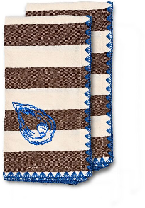 Ścierka kuchenna Bubba w kolorach kremowym i brązowym czerpie inspirację z Europy Południowej – gdzie klasyczne pasy spotykają się z kobaltowoniebieskimi haftami ostryg w nieoczekiwanym i zabawnym połączeniu. Strzępione krawędzie oraz urocze detale sprawiają, że stanowi wyrazisty akcent w kuchni. Doskonale komponuje się z serwetkami i obrusem z tej samej serii, tworząc spójną aranżację stołu. Produkt pakowany w zestawie 2 sztuk, przewiązany taśmą i kokardą. Projekt: Byon Studio.